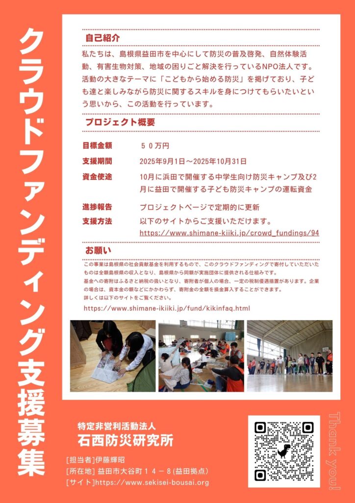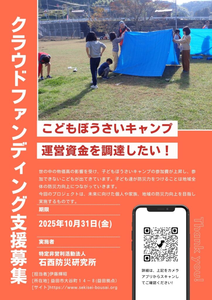 石西防災研究所では、現在子ども防災キャンプをするための資金を集めるためのクラウドファンディングに挑戦しています。