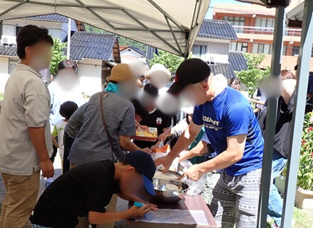 当日は炎天下の中、たくさんの地域の人に集まっていただき、ポリ袋炊飯や避難所設営を体験してもらい、参加してくれた中学生が、授業でやったことがあったそうで、地域の人たちと一緒に率先して避難所テントやパーテーションを組み立てていたのが印象的でした。