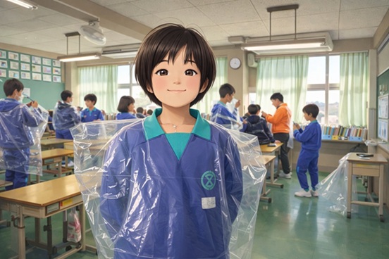 作り方は簡単なのですが、作ってみると結構奥が深く、夢中になるものです。子ども達だけではなく、担当の先生や当団体のスタッフもノリノリでビニール袋ポンチョを作っていました。
